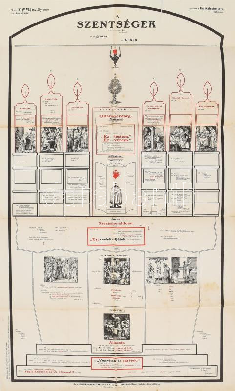 Description: 1925 A szentségek vázlatcsoportja. Elemi IV. (V-VI.) osztály részére írta: Gabriel Antal. Iskolai oktatóplakát. Bp., Stephaneum-ny., kissé foltos, sérült, 69x41 cm