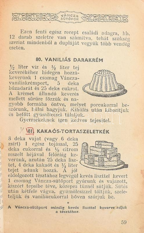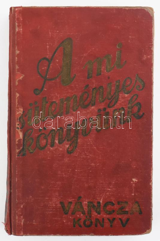 A mi süteményes könyvünk. Gyakorlati útmutatások a torták, mignonok és mindenféle sütemények helyes elkészítésére és díszítésére. Bp., 1939, Váncza és Társa Tápszer- és Vegyészeti Gyár, 255+(1) p. Kiadói egészvászon-kötés, kissé sérült, viseltes borítóval, egy-két sérült lappal, néhány helyen ceruzás bejegyzésekkel.