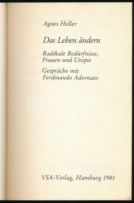 Heller Ágnes: Das Leben ändern. Radikale Bedürfnisse, Frauen und Utopi... https://www.darabanth.com/en/482-Online-auction/482.0/Books/Books-Social-sciences~500026/Heller-Agnes-Das-Leben-andern-Radikale-Bedurfnisse-Frauen-und-Utopie-Gesprache-mit-Ferdinando~II3295806