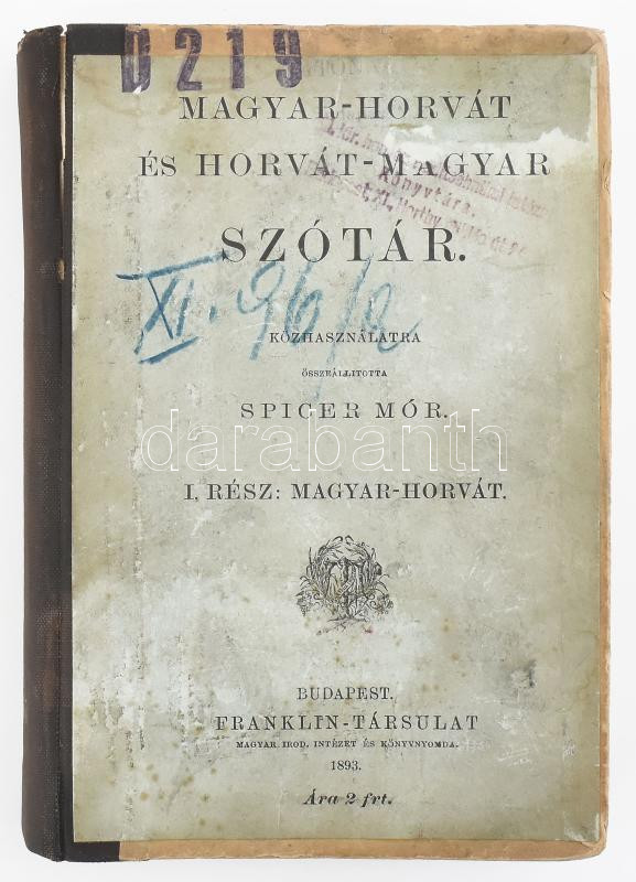 Spicer Mór: Magyar-horvát és horvát-magyar szótár. I. rész: Magyar-horvát. Közhasználatra összeállította: - - . Bp., 1893, Franklin-Társulat, 4 sztl. lev.+ 397+(3) p. Átkötött félvászon-kötésben, kissé viseltes, sérült borítóval, régi intézményi bélyegzőkkel.