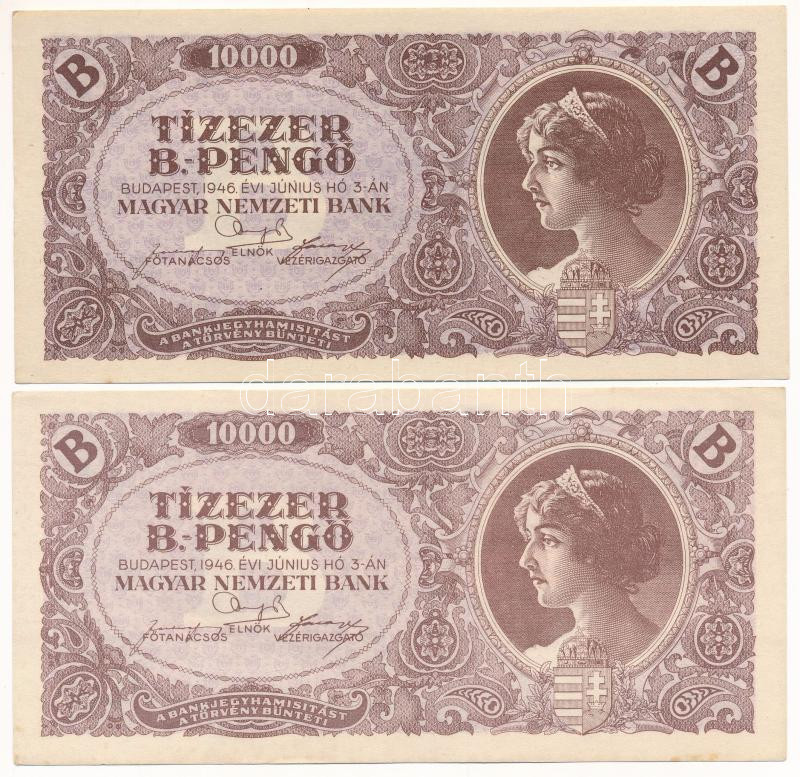 https://www.darabanth.com/en/482-Online-auction/482.0/Numismatics/Hungarian-Banknotes~1000008/1946-10000BP-2x-T-AU-egyik-oldalan-kisebb-gyurodesek~II3297560