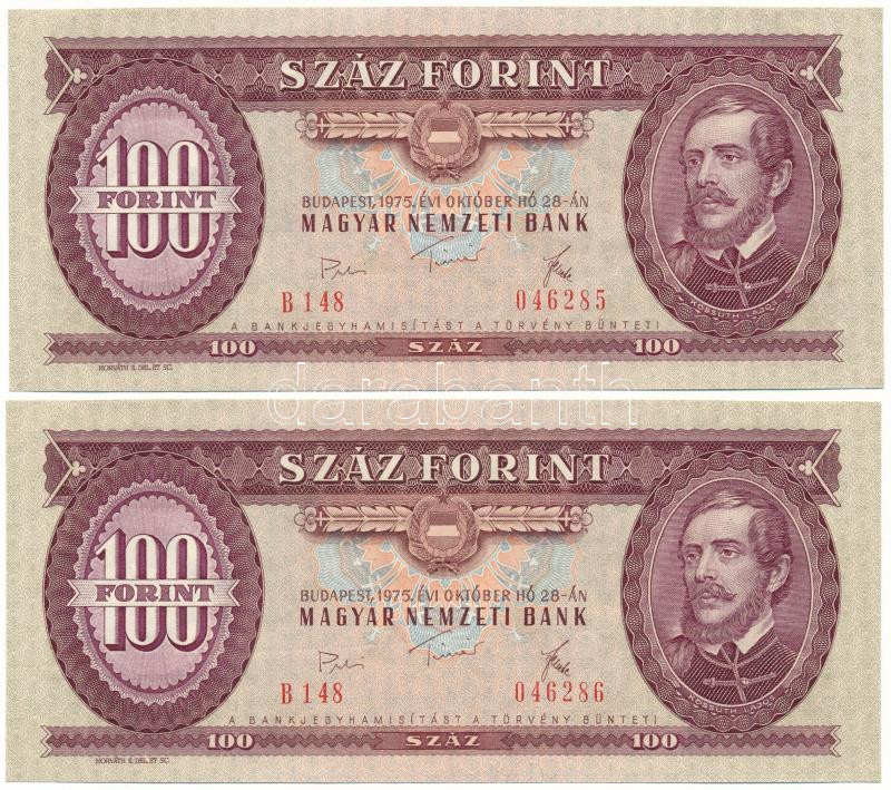 1975. 100Ft (2x) sorszámkövetők "B 148 046285 - B 148 046286" T:AU hullámos papír, mindkettőn hosszában átszelő vonal nyomódás