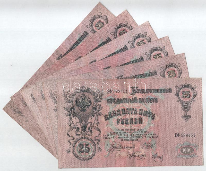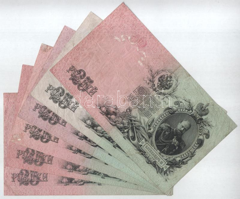 Description: Orosz Birodalom 1909. (1917) 25R (6xklf) mindegyik különböző pénztáros aláírással. Szign.: Shipov (Az állami bank igazgatója) T:F, közte szép papír, egyiken pici anyaghiány