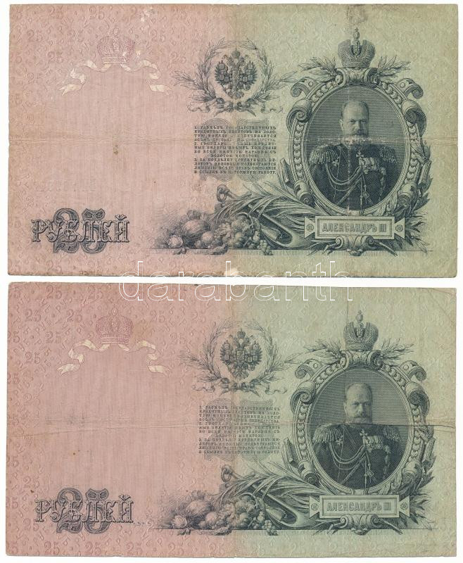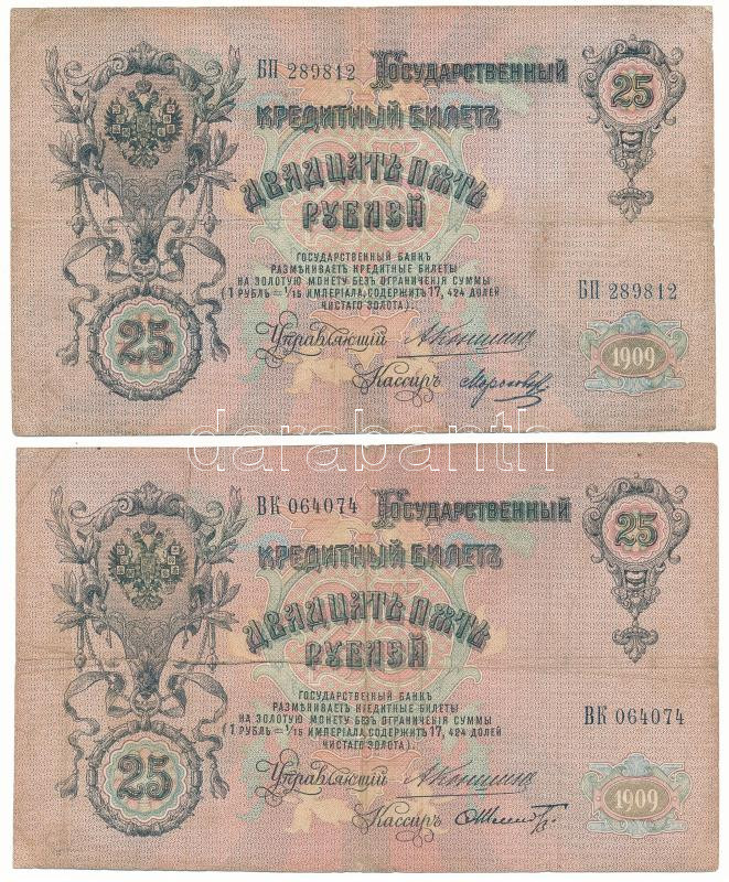 Orosz Birodalom 1910-1914. (1909) 25R (2xklf) mindegyik különböző pénz... https://www.darabanth.com/en/482-Online-auction/482.0/Numismatics/Worldwide-banknotes~1000015/Orosz-Birodalom-1910-1914-1909-25R-2xklf-mindegyik-kulonbozo-penztaros-alairassal-Szign-~II3291536