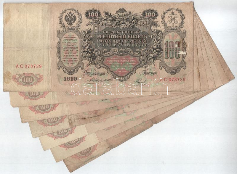 Orosz Birodalom 1911-1914. (1910) 100R (7xklf) mindegyik különböző pén... https://www.darabanth.com/en/482-Online-auction/482.0/Numismatics/Worldwide-banknotes~1000015/Orosz-Birodalom-1911-1914-1910-100R-7xklf-mindegyik-kulonbozo-penztaros-alairassal-Szign-~II3291573