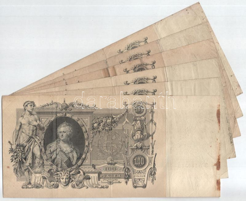 Orosz Birodalom 1914-1920. (1910) 100R (6xklf) mindegyik különböző pén... https://www.darabanth.com/en/482-Online-auction/482.0/Numismatics/Worldwide-banknotes~1000015/Orosz-Birodalom-1914-1920-1910-100R-6xklf-mindegyik-kulonbozo-penztaros-alairassal-Szign-~II3291561