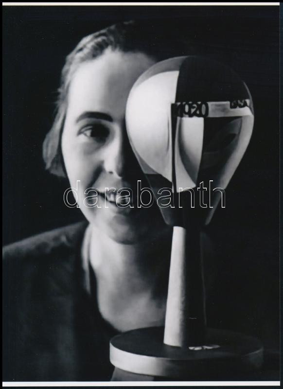 Description: cca 1920 Sophia Taeuber Arp (1889-1943) svájci művész felvétele (Dada portré), 1 db modern nagyítás, jelzés nélkül, a néhai Népművelési Intézet fotóművészeti referensének gyűjteményéből, ,,A fotóművészet egyetemes története" című előadásának anyagából, 21x15 cm