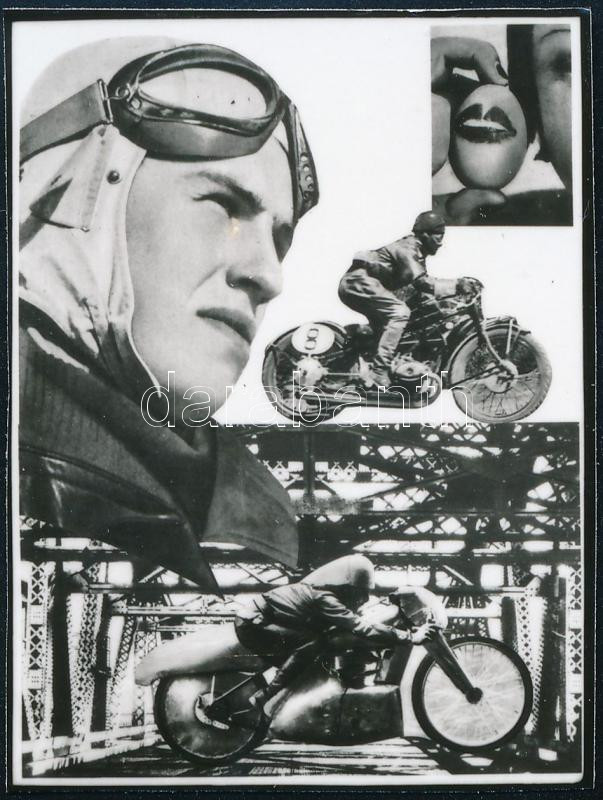 Description: cca 1930-as 1940-es évek, ismeretlen kollázs/montázs készítő művész alkotásának későbbi prezentációja (Motoros), miniatűr fotón, ezüstzselatinos fotópapíron, 5,2x3,8 cm
