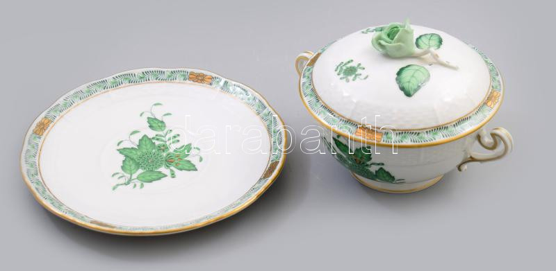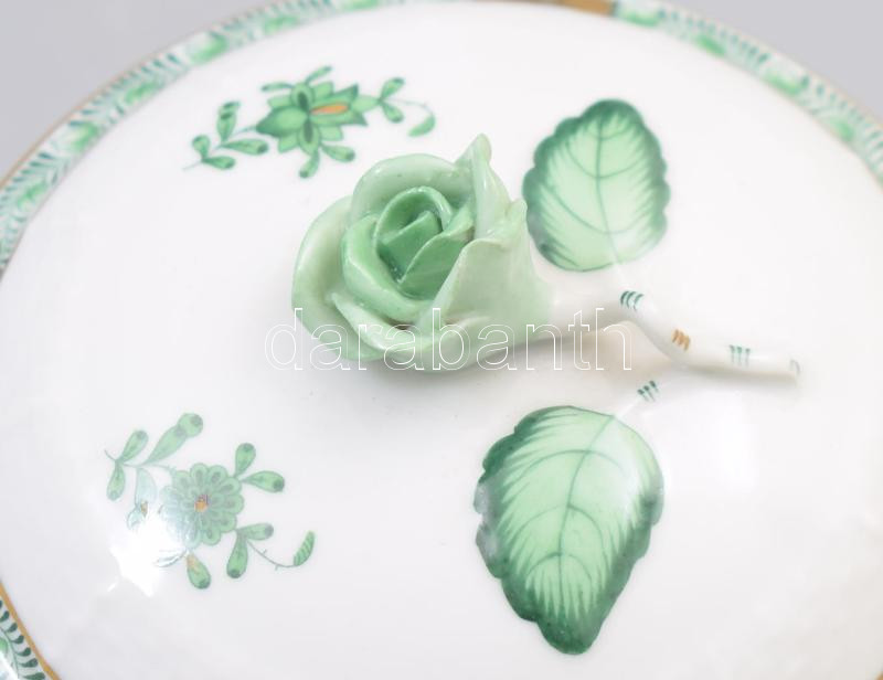 Herendi Apponyi zöld mintás fedeles leveses csésze rózsa fogóval, alát...