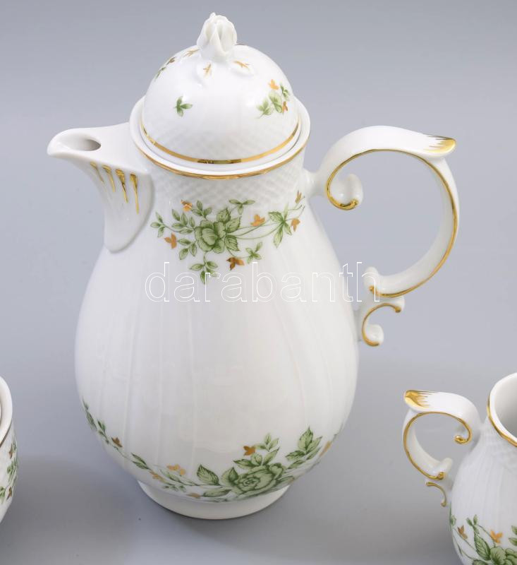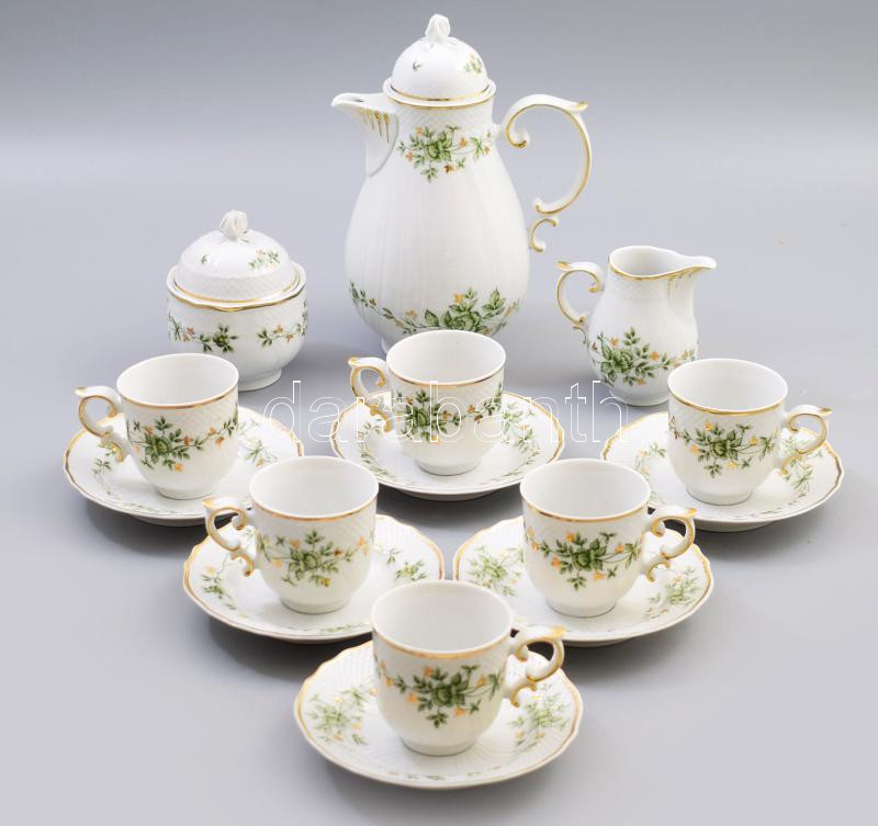 Hollóházi Erika mintás kávés készlet. Jelzett, minimális pattogzással, teljes.