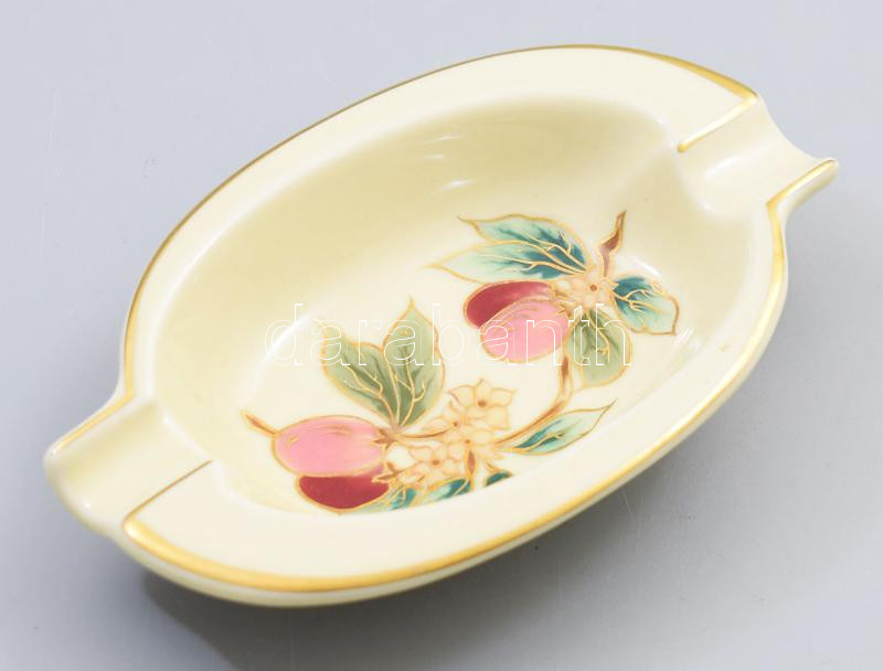 Zsolnay gyümölcs- és virágmintás hamuzó. Kézzel festett, jelzett (Halász Imréné), minimális kopással, 15,5x10 cm