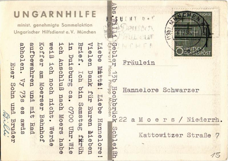 Description: 1956 Helft Ungarn! Ungarnhilfe minist. genehmigte Sammelaktion Ungarischer Hilfsdienst e. V. München / 1956-os forradalom német segély propagandalapja (EB)