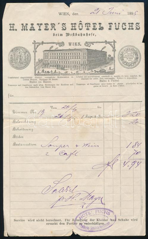1895 Bécs (Wien), H. Mayer's Hotel Fuchs fejléces számla a szálloda lá...
