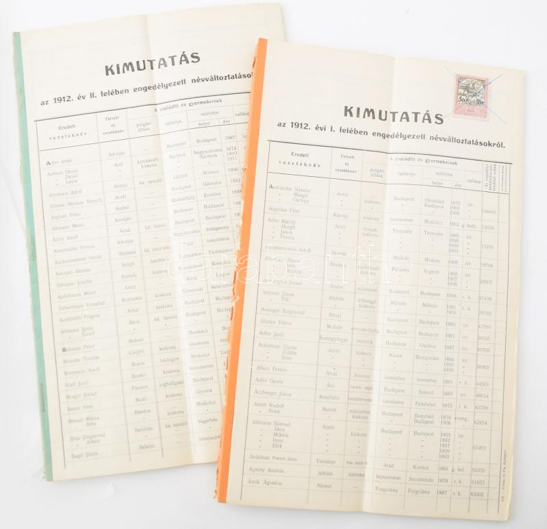 1912 Kimutatás az év I. és II felében engedélyezett névváltoztatásokról vallási felekezet és állás feltüntetésével 62+46 p .