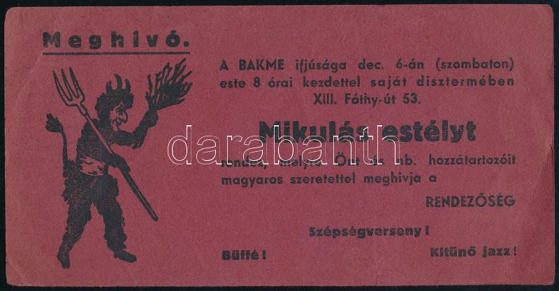 1941 Budapest-Angyalföldi Keresztény Munkás Egyesület Ifjúsági Vezetőségének meghívója Mikulás estélyre, szakadással