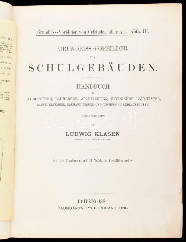 Klasen, Ludwig: Grundriss-Vorbilder von Schulgebäuden. Handbuch für Baubehörden, Bauherren, Architekten, Ingenieure, Baumeister, Bauunternehmer, Bauhandwerker und technische Lehranstalten. Grundriss-Vorbilder von Gebäuden allert Art. Abth. III. Leipzig, 1884, Baumgärtner's Buchhandlung. Fekete-fehér illusztrációkkal. Német nyelven. Kiadói aranyozott egészvászon-kötés, kissé viseltes, kopott borítóval, az elülső borítón ázásnyommal