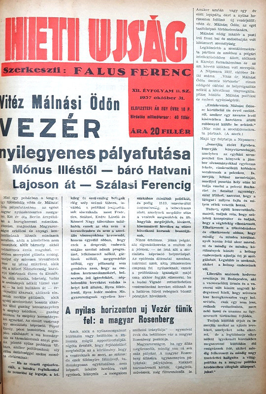 [Folyóirat] Heti Ujság. Falus Ferenc riportlapja. Megjelenik minden szombaton. XII. évfolyam, 18-51/52. szám. (1937. május 9. - 1937. december 25.) [Egybekötve.] Budapest, 1937. Kellner Albert Könyvnyomdája. A lapszámok terjedelme egységesen 12 oldal. A Falus Ferenc (1896-1971) újságíró, bűnügyi újságíró szerkesztésében megindult heti bulvármagazin 1926 novemberében indult, és egészen 1938. évi betiltásáig létezett. A korábban több lapnál dolgozó újságíró az 1920-as évek elején az Est-lapok bűnügyi rovatát vezette. Az ellentmondásos módszerekkel dolgozó újságíró egy írásáért börtönbüntetést is kapott, sajtóvétségeiért több ízben elmarasztalták, ám a jól feltérképezett olvasóközönsége számára sajátos hangvételben, jellegzetes perspektívában készített sajtótermék több mint egy évtizedig, belügyminiszteri betiltásáig létezett. A szenzációorientált retorika ellenére a folyóirat éles, ha nem is teljesen elfogulatlan figyelemmel kommentálja az irodalmi- és sajtópolitika, a pesti közélet témáit, lelkesen méltatja az egymással szorosan összefonódó belvárosi színházi és szórakoztatóipar eredményeit és pletykáit, illetve évfolyamról évfolyamra egyre nagyobb terjedelemben szemlézi a hazai antiszemita közbeszéd jelenségeit -- évfolyamunk a markáns válogatású hírek és botrányhírek mellett antiszemita jelenségek szemlézőjének tekinthető. A tizenkettedik évébe lépő folyóiratnak már népesebb írógárdája van, az állandó kolumnista Falus Ferenc és Kósa Miklós mellett Peterdi Andor, Reiter László és Tábori Jenő újságírók is közreműködnek, egy-egy közhírességtől pedig időről időre rövidebb interjúkat is szerez a lap (évfolyamunkban Germanus Gyula nyilatkozik). Jellemző cikkcímek: A világhírű Kertész Mihály azt kérdi Hollywoodban: "Kizárt dolog az, hogy a kerepesi temetőben földeljenek el?" Gyönyörű levél a híres magyar rendező honvágyáról -- Szekfű Gyula vezetésével új szellemi front alakul a germán befolyás ellen -- Kivándorol Hatvany Lilly. A Hollywoodba készülő irodalmi bárónő érzelmes búcsúja -- Kiskáté kezdő antiszemita szerkesztők számára -- Pestiek a spanyol lövészárokban -- Egry Mária retikülje és a lopással gyanúsított vendégek -- Aschner Lipót, egy nagyiparos regénye -- Az állam visszavonja az Ernst-múzeum árveréstartási és aukció engedélyét -- Zsidó jampecek, akik termelik az antiszemitizmust -- Meggyalázta egy antiszemita vezér a halott Miklós Andor emlékét -- Ki az a jobboldali körökben ünnepelt Paolo Orania olasz antiszemita író? -- Joshua Albert pesti nagyiparos, a Moktár és a Filtex igazgatósági tagja elájult, amikor kiderült, hogy a törvény előtt álló Bosel három millióval becsapta -- Őszinte írás hollywoodi magyar karrierekről -- Aschner és a hiúság -- Egy magyar katolikus pap kegyetlen könyve az új német vallásról és annak pápájáról: Rosenbergről -- A nagybankok altisztjeit szervezik be a nyilas propagandába a saját gazdáik ellen -- Így lett pesti milliomos a lodzi rongyszakértő. Silberfenig Juda és Jaszl karriérje Galíciától Budakalászig -- Három törvényhozó és Szálasi -- Kétezer magyar hozzátartozója izgul Pesten a sangháji pokol miatt -- "Kínos feledékenység": Rózsahegyi Kálmán és társai, akik nem kaptak meghívót a Nemzeti Színház jubileumára -- Fajtiszta bankigazgatókat követel Szálasi mester -- A "renegát" Veres Péter furcsa válasza Milotaynak -- Szabad-e pletykarovatot csinálni? -- Vitéz Málnási Ödön vezér nyílegyenes pályafutása Mónus Illéstől báró Hatvany Lajoson át Szálasi Ferencig -- A pornográf Zichy-regények titka -- Szenzációs leleplezés német térképekről, amelyek az egész Dunántúlt bekebelezik, Budával együtt a Német Birodalomba -- Szép Ernő a porondon -- Molnár Ferenc leleplezi az ál Liliomot -- Egy költő halálára: József Attiláról. Példányunk első leveleinek sarkán apró gyűrődés, a kötéstáblák fűzése meggyengült. Lakatos 796. Sérült, hiányos gerincű korabeli félvászon kötésben.