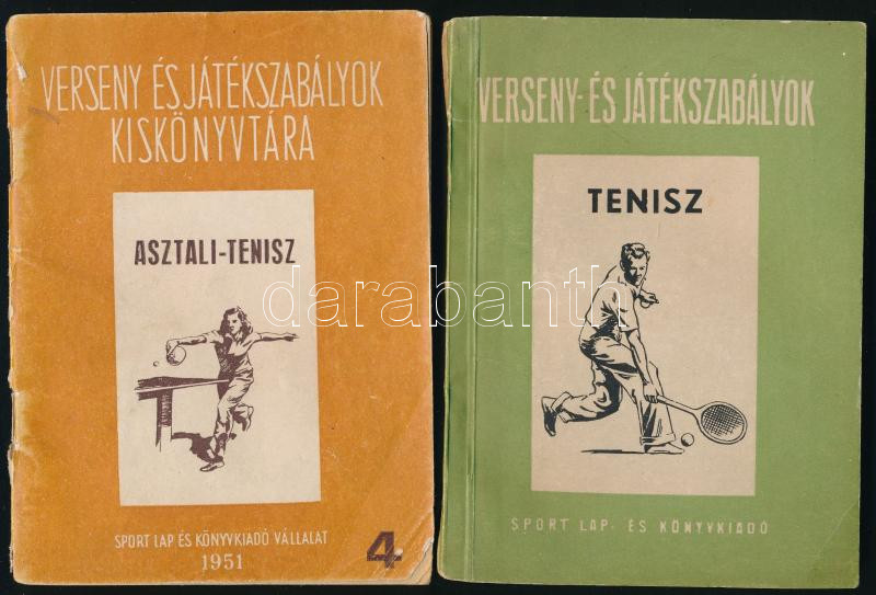 Tenisz versenyszabályok. Bp., 1951, Sport Lap- és Könyvkiadó. Kiadói tűzött papírkötés, kissé viseltes borítóval, a hátsó borítón ceruzás firkákkal. + Az asztalitenisz szabályai. Bp., 1954, Sport Lap- és Könyvkiadó. Kiadói papírkötés. Megjelent 2100 példányban.