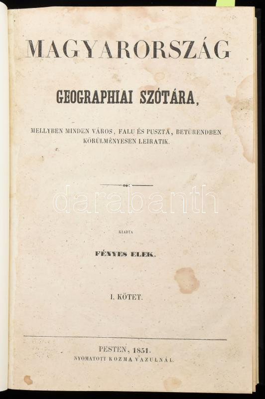 Fényes Elek: Magyarország geographiai szótára, mellyben minden város, falu és puszta, betürendben körülményesen leiratik. I-II. kötet, egybekötve. Pesten, 1851, Kozma Vazulnál 312+285 p. Átkötött modern félvászon-kötésben, körbevágott, foltos lapokkal.