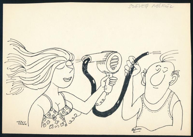 Földes Vilmos (1942-): Hajszárítás (karikatúra, cím nélkül). Tus, papír, jelzett. 15×21 cm.