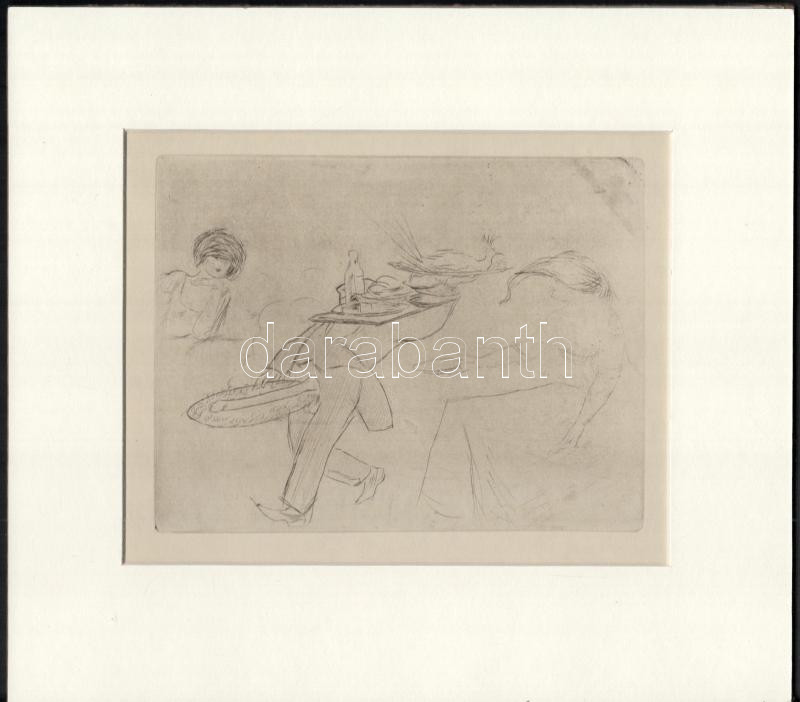 Description: Vértes Marcell (1895-1961): Pincér (erotikus-pornográf grafika). Rézkarc, papír, jelzés nélkül. Az 1921-ben 550 példányban megjelent Le pays a mon gout c. mappából, paszpartuban, 12,5×16,5 cm