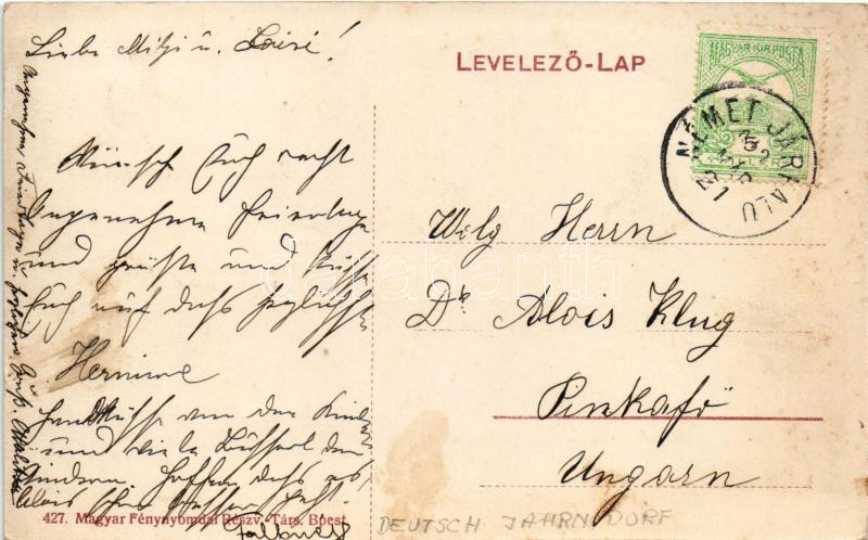 1913 Németjárfalu, Deutsch Jahrndorf; plébánia és iskola, Római katolikus templom, Gerstweiber György vegyeskereskedő üzlete / Schule, Kirche, Pfarrhof, Warendhandlung / school, church, parish, shop (fl)