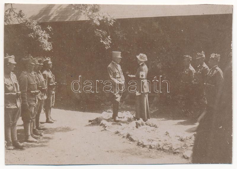Description: ~1916 Auguszta főhercegnő, mint Vöröskeresztes előkelőség megszemlél egy osztrák-magyar csapatot / Princess Auguste of Bavaria visiting a K.u.k. military camp. photo (8,2 x 5,8 cm) (fl)