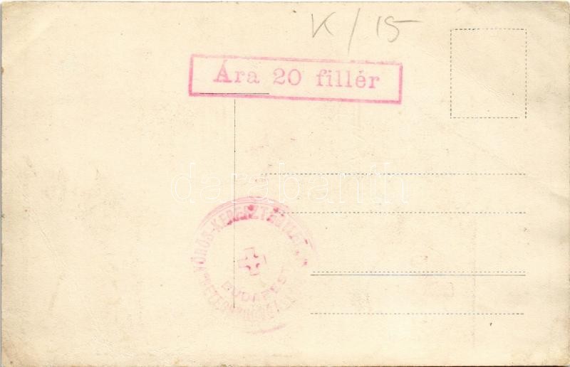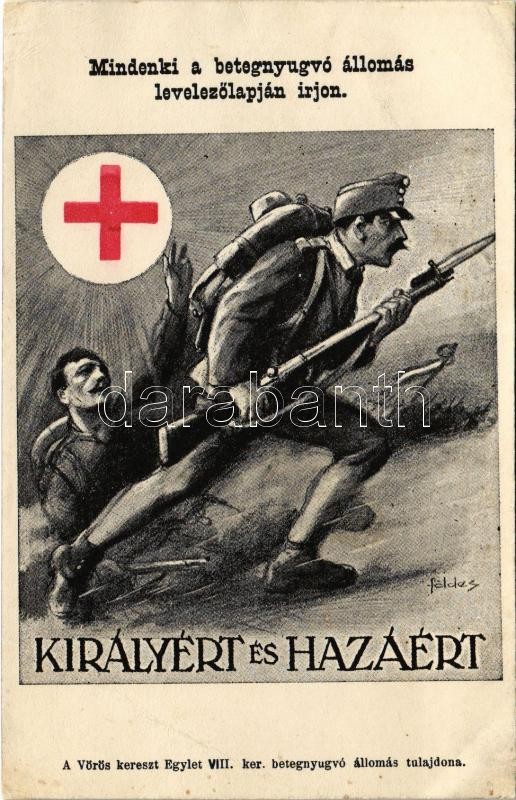 Description: Királyért és Hazáért! A Vörös Kereszt Egylet dunaparti betegnyugvó állomásának tulajdona / WWI Austro-Hungarian K.u.K. military art postcard, Red Cross propaganda, support fund s: Földes + "Vörös-Kereszt Egylet betegnyugvó állomása Budapest" (ázott / wet damage)