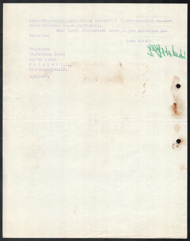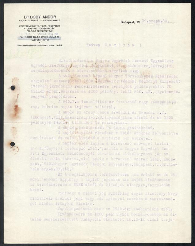 1939 Dr. Doby Andor ügyvéd aláírt fejléces levele, folttal