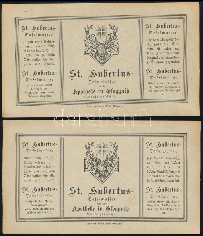 XX. század eleje St. Hubertus-Tafelwasser aus der Aphoteke in Gloggnitz, Gloggnitz, Anton Kiefer-ny., német nyelvű reklámlapok, 11x20 cm