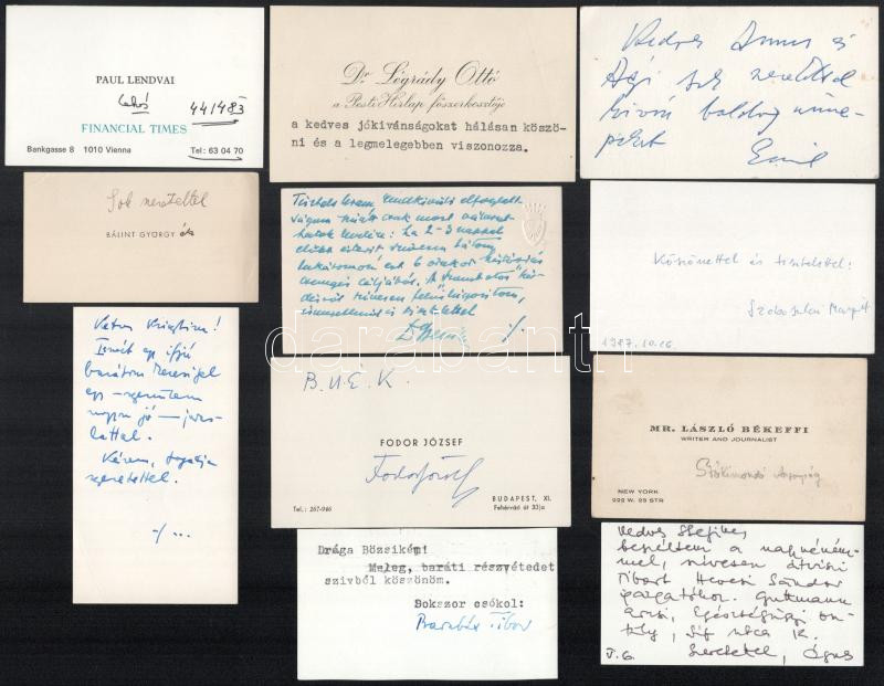 Aláírás és autográf sorok gyűjteménye híres írók, költők, névjegykártyáján: Grandpierre Emil, Bálint György, Bajomi Lázár Endre (2x),Békeffi László, dr. Légrády Ottó, Gergely Ágnes, Bevilaqua-Borsodi Béla, Fodor József, Barabás Tibor, Paul Lendvai,