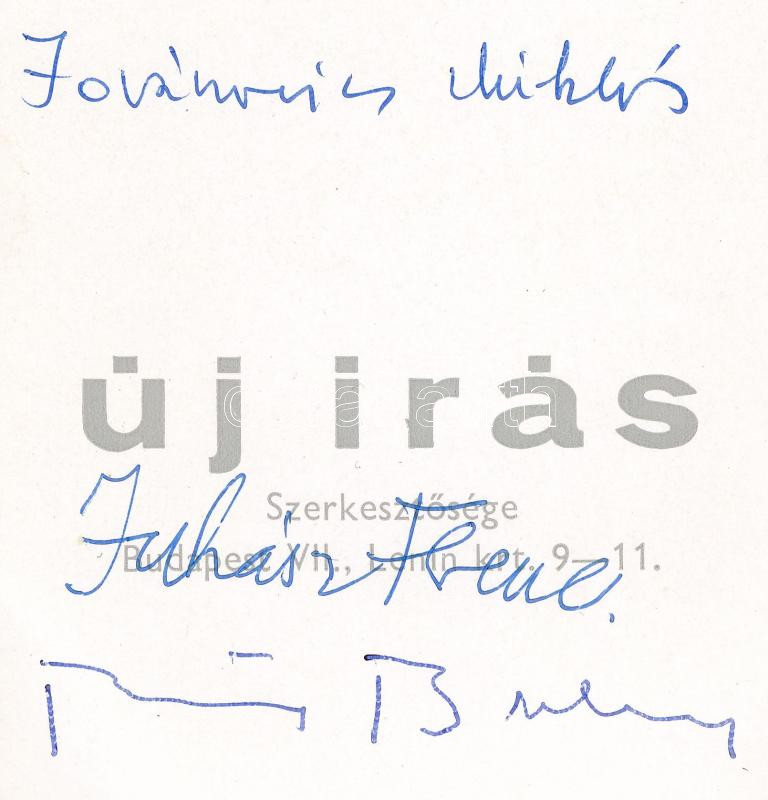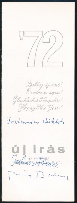 Description: Jovánovics Miklós (1932-2002) újságíró, kritikus, Juhász Ferenc (1928-2015) Kossuth-díjas és József Attila-díjas költő, illetve Bertha Bulcsu (1935-1997) József Attila-díjas író, publicista autográf aláírása újévi üdvözlőlapon