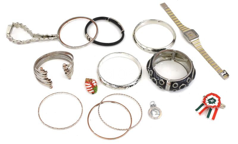 Egy doboznyi bizsu tétel: fém karreifek, női kvarc szerkezetű órák