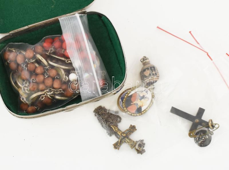 Kegytárgy tétel: porcelán medál, rózsafüzérek, feszületek, kis fém dob...