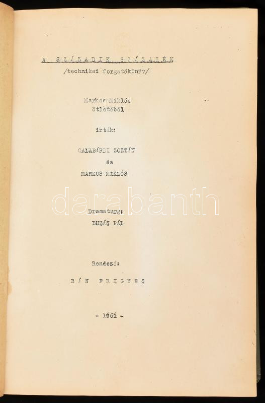 1961 A századik százalék. Írták: Galabárdi Zoltán és Markos Miklós. Re... https://www.darabanth.com/en/484-Online-auction/484.0/Art-and-other-collectibles/Historical-documents-manuscripts~1500023/1961-A-szazadik-szazalek-Irtak-Galabardi-Zoltan-es-Markos-Miklos-Rendezo-Ban-Frigyes~II3148112