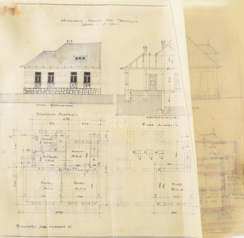 cca 1910 Kétszobás fa oromzatos családi ház tervrajza 16 db kézzel rajzolt látványos terv és látványterv kb 40x30 cm ig