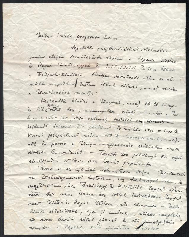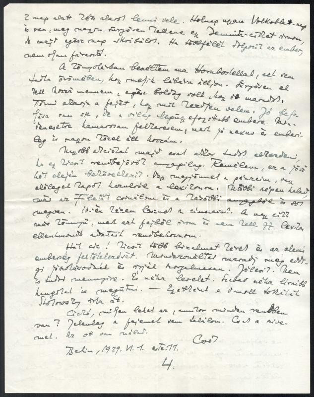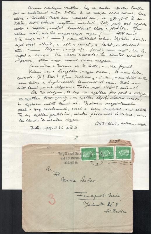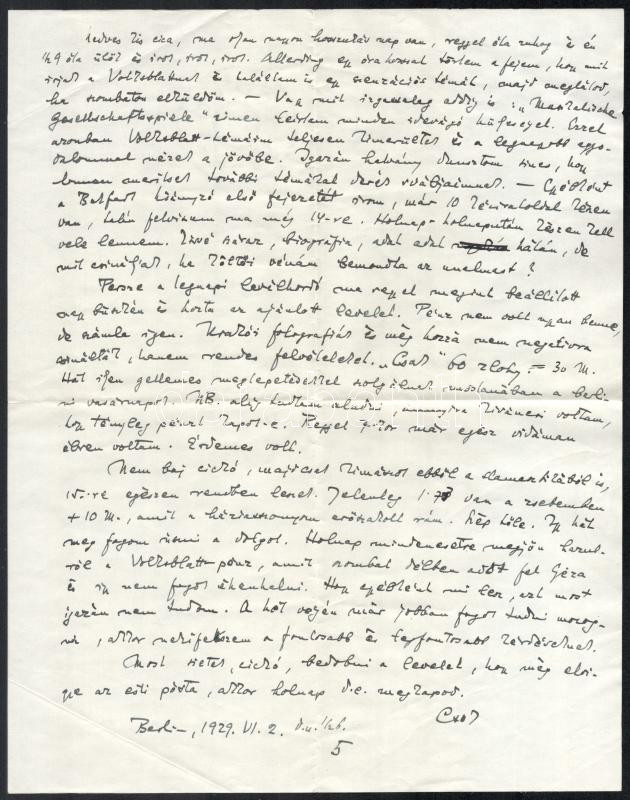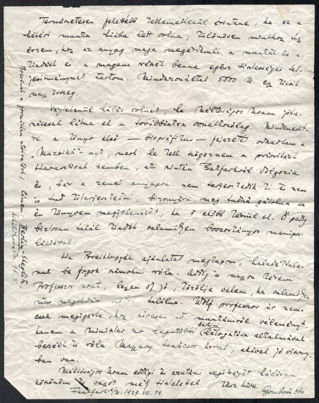 cca 1928-1929 Gombosi Ottó (1902-1955) zenetörténész, zenekritikus autográf sorai 5 db levélben Seiber Mária zongoraművész, zongoratanárhoz, Keresztury Dezső későbbi feleségéhez Németországból, részben érdekes zenetörténeti adalékokkal, beszámolók a berlini életről, egyikben említve Domanovszky nevet (feltehetően Ákos). Levelek eredeti borítékban. + 1929 Gombosi Ottó 1 db további levele ismeretlen professzorhoz egy zenetörténeti könyv megjelentetése ügyében, 2 beírt oldal, autográf aláírásával
