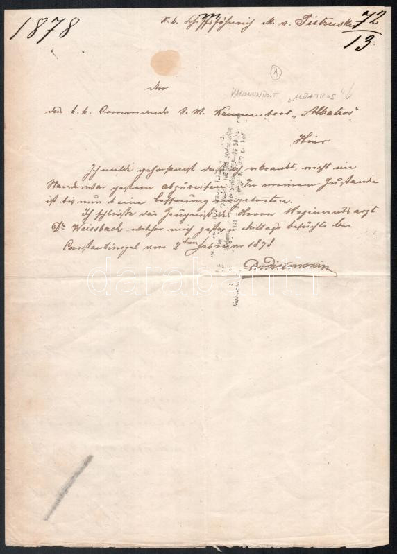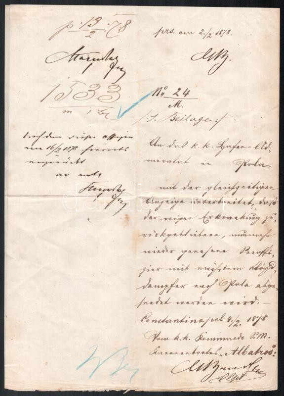 1878 Az S.M.S. Kanonenboot Albatros résztvevő hajó parancsnoka részére írt levél a Polai kikötőigazgatóságtól két beírt oldalon amikor konstatninápolyi állomás hajóként szolgált / Handwritten document addressed to the command of the gunboat S.M.S. Albatros in Constantinople, dated 4./2. 1878, at the time when the Albatros was station ship in the Ottoman capital.