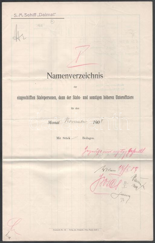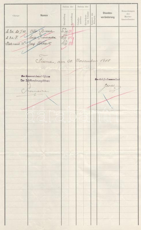 1908 Az S.M.S. Dalmat kimutatása az 1908 Novemberében fedélzetre lépett személyekről. A parancsnok aláírásával és a hajó pecsétjével, alul részletezve a személyek / Namenverzeichnis der eingeschifften Stabspersonen, etc. for the month of November 1908. Four-page document signed in Fiume on November 30, 1908. The signatures of both ship officers are illegible, unfortunately. Seal: S. M. Schiff ,,Dalmat" Page two lists the following officers, presumably serving on S.M.S. Dalmat: Linienschifflseutnant Otto Brosch (gazetted Linienschiffsleutnant on November 1, 1897; not found in the 1917 Rangliste) Linienschiffsleutnant Erich Prochaska (born in 1880, gazetted Fregattenleutnant on May 1, 1904; Linienschiffsleutnant May 1, 1909)