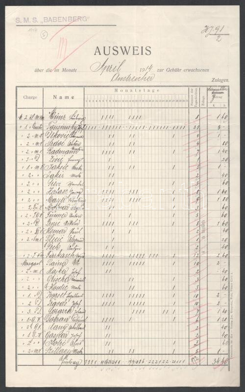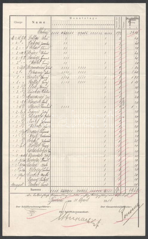 1914 Az S.M.S. Wien osztrák-magyar hadihajó kimutatása a katonáknak fizetett ellátmányokról . A parancsnok aláírásával és a hajó pecsétjével, részletezve a személyekkel / Official listing of painter allowances paid for April 1914. One-page, two-sided Ausweis, signed in Budua on April 31 (sic) 1914.