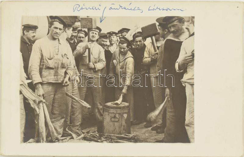 Az S.M.S. Babenberg osztrák-magyar hadihajó matrózai szárított halat vételeznek, fotólap. / A large group of sailors from S.M.S. Babenberg stand around several of their mates who, armed with huge mallets, are pounding some sort of dried fish (Stockfisch in German). The man in the center holding a mallet is identified as Rónai Larsson. Black-and-white photo postcard
