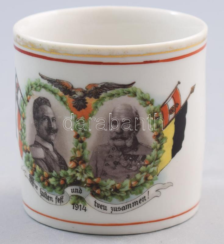 cca 1914 Háborús emlékbögre Ferenc József és II. Vilmos arcképével, kopással, m: 7 cm