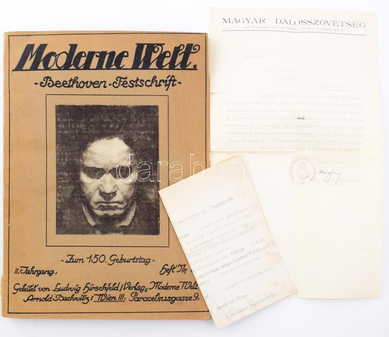 Beethoven-évfordulóval kapcsolatos tétel (3 db): 1927 A M. Kir. Vallás- és Közoktatásügyi Minisztérium levele Kárpáti (Kárpáthy) Sándor (1872-1939) zenetanár, zeneszerző részére, amelyben értesítik a Beethoven-centenárium alkalmából felállítandó bizottság tagjává választásáról; valamint az Országos Magyar Dalosszövetség Kárpáti Sándornak írt levele, amelyben köszönetet mondanak a Beethoven-centenárium rendezését előkészítő ülésen a Dalosszövetség bevonása érdekében tett felszólalásáért + 1920 Moderne Welt, Beethoven-Festschrift, II. Jahrgang, Heft 9. Beethoven születésének 150. évfordulója alkalmából kiadott, német nyelvű emlékkiadvány. Kiadói papírkötés, kissé sérült.