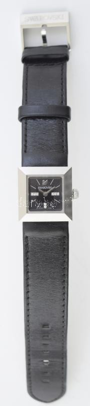 Swarovski női karóra. Kristályokkal díszített kvarc szerkezettel, bőr szíjjal, jelzett, működik. 25x22 mm