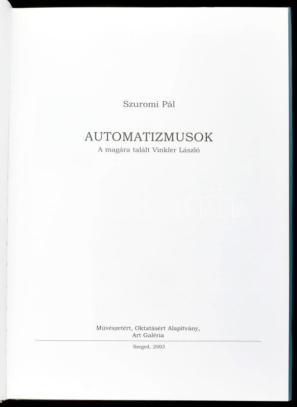 Szuromi Pál: Automatizmusok. A magára talált Vinkler László. Szeged, 2... https://www.darabanth.com/en/484-Online-auction/484.0/Books/Books-Architecture-Art~1000037/Szuromi-Pal-Automatizmusok-A-magara-talalt-Vinkler-Laszlo-Szeged-2003-Muveszetert-Okta~II3259716