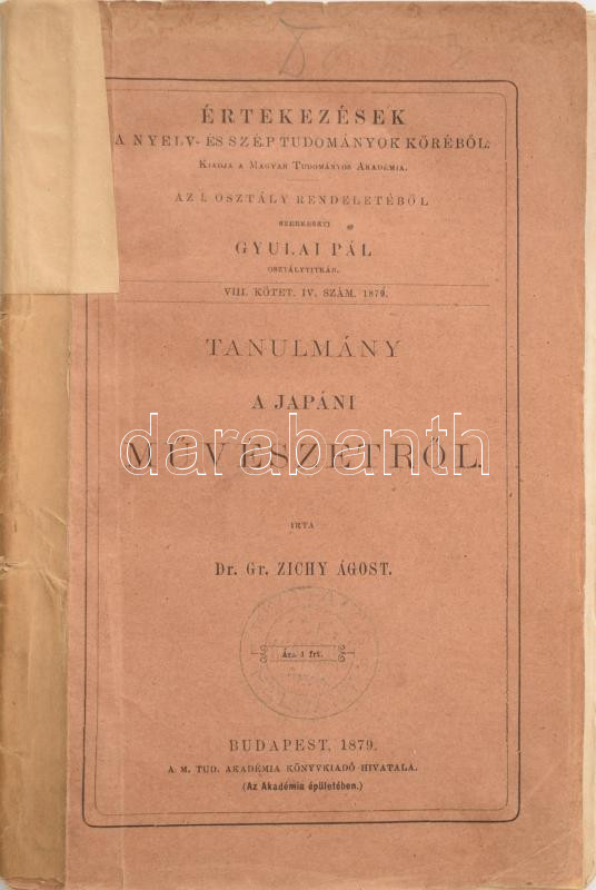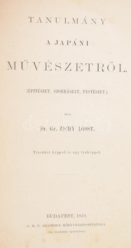 Zichy Ágost: Tanulmány a japáni művészetről. (Építészet, szobrászat, festészet.) Bp., 1879, MTA, 85+3 p.+XVII t.+1 t. Kiadói papírkötés, javított borítóval, kijáró lapokkal, szétvált könyvtesttel.