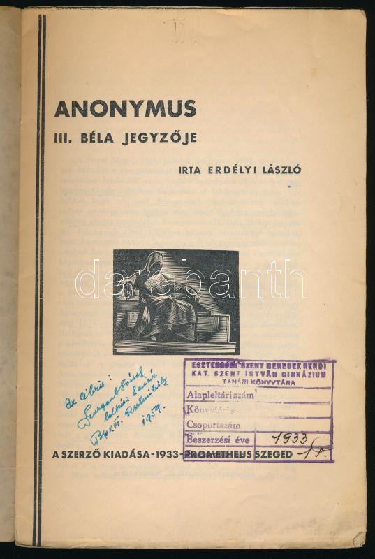 Dr. Erdélyi László: Anonymus III. Béla jegyzője. Szeged, 1933, Szerző. Kiadói papírkötés, kopottas állapotban.