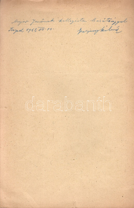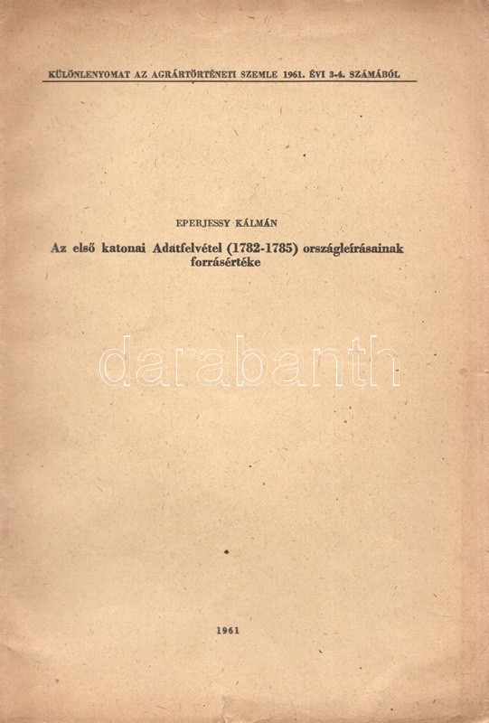 Dedikált: "Major Jenőnek kollegista barátsággal Eperjessy Kálmán. Szeged, 1961. XII. 10." Eperjessy Kálmán (1893-1976) településtörténész, levéltáros az első katonai adatfelvétel településföldrajzi jelentőségét vizsgálja rövid dolgozatában.