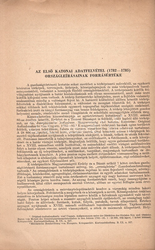 Az első katonai adatfelvétel (1782-1785) országleírásainak forrásértéke. (Dedikált.)