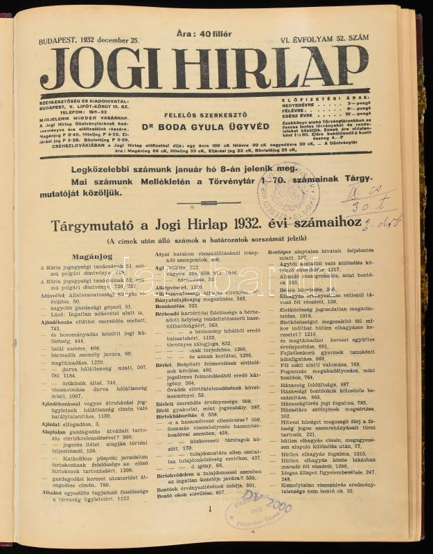 1932 Jogi Hírlap VI. évf. 52+1-51 sz. Szerk.: Boda Gyula. Bp., Centrum... https://www.darabanth.com/en/484-Online-auction/484.0/Books/Books-Law~1000018/1932-Jogi-Hirlap-VI-evf-52plus1-51-sz-Szerk-Boda-Gyula-Bp-Centrum-16plus408-p-Atkotott-fel~II3314105